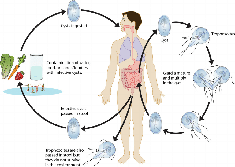 Η λαμβλίαση μεταδίδεται από το νερό ή τροφές που έχουν μολυνθεί από τα κύστεα του παρασίτου. Οι κύστες εξασφαλίζουν την επιβίωση του παρασίτου σε διάφορα περιβάλλοντα. Όταν καταναλώνεται μολυσμένο νερό ή τροφή, οι κύστες ανοίγουν στο εντερικό σύστημα και εκκολπώνονται σε τρόφια, προκαλώντας συμπτώματα.